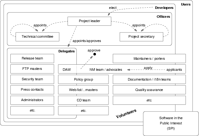 - Une constitution décrit le fonctionnement interne du projet, les méthodes de prise de décisions et les rôles des différents acteurs : le chef du projet, le secrétaire, les développeurs, etc. La démocratie Internet utilise une méthode de vote par pondération par classement : la méthode Schulze (une méthode Condorcet)12.